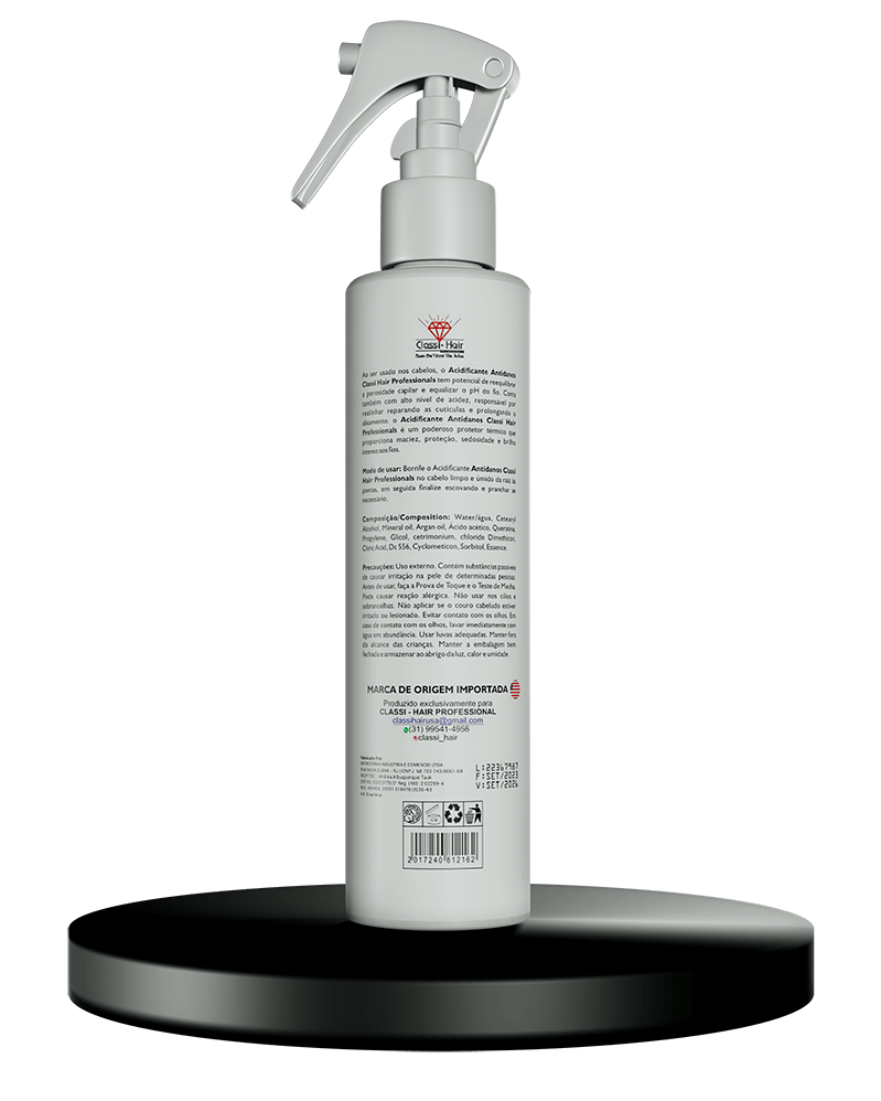 Ao ser usado nos cabelos, o Acidificante Antidanos Classi-Hair Professionals tem potencial de reequilibrar a porosidade capilar e equalizar o pH do fio. Conta também com alto nível de acidez, responsável por realinhar reparando as cutículas e prolongando o alisamento. O Acidificante Antidanos Classi-Hair Professionals é um poderoso protetor térmico que proporciona maciez, proteção, sedosidade e brilho intenso aos fios.