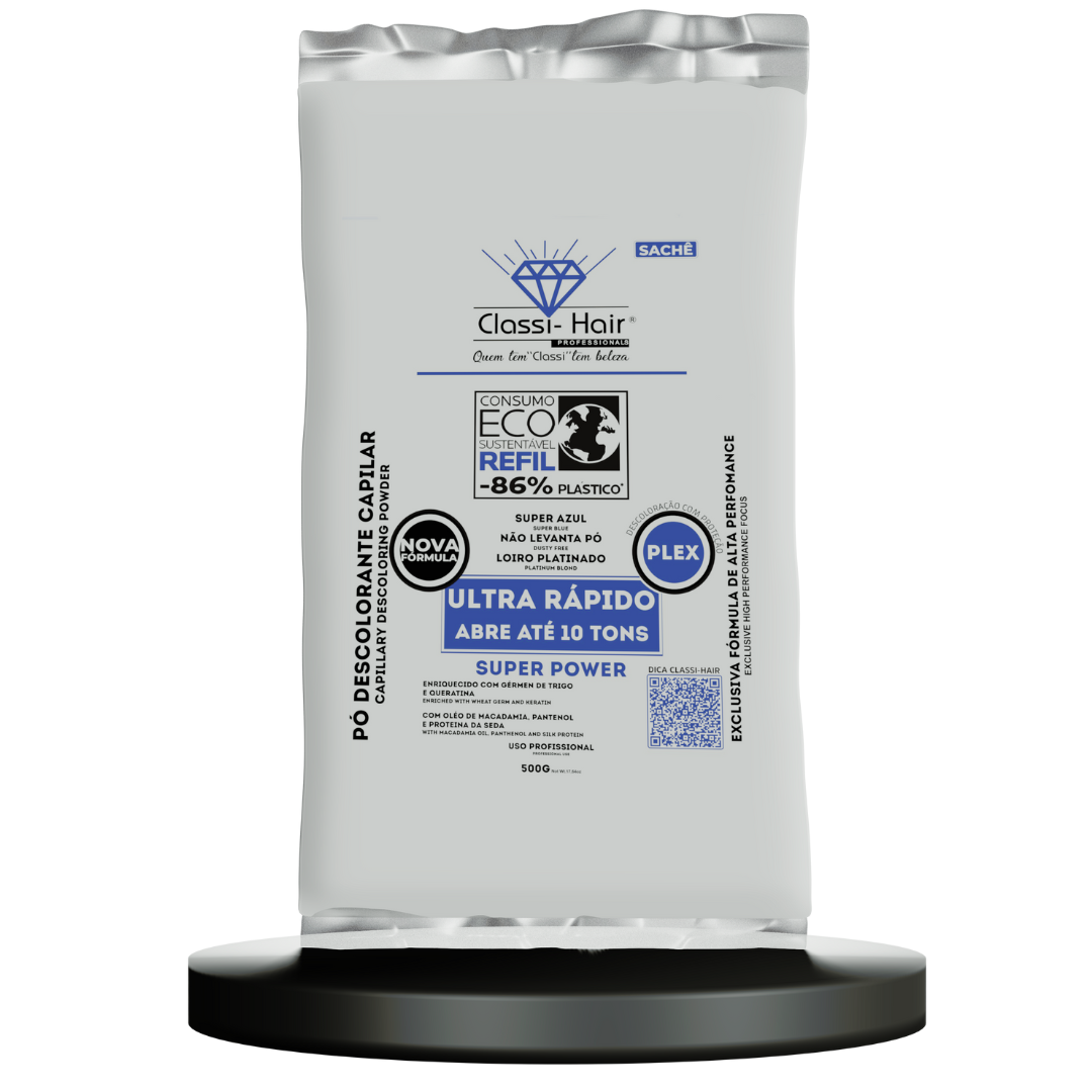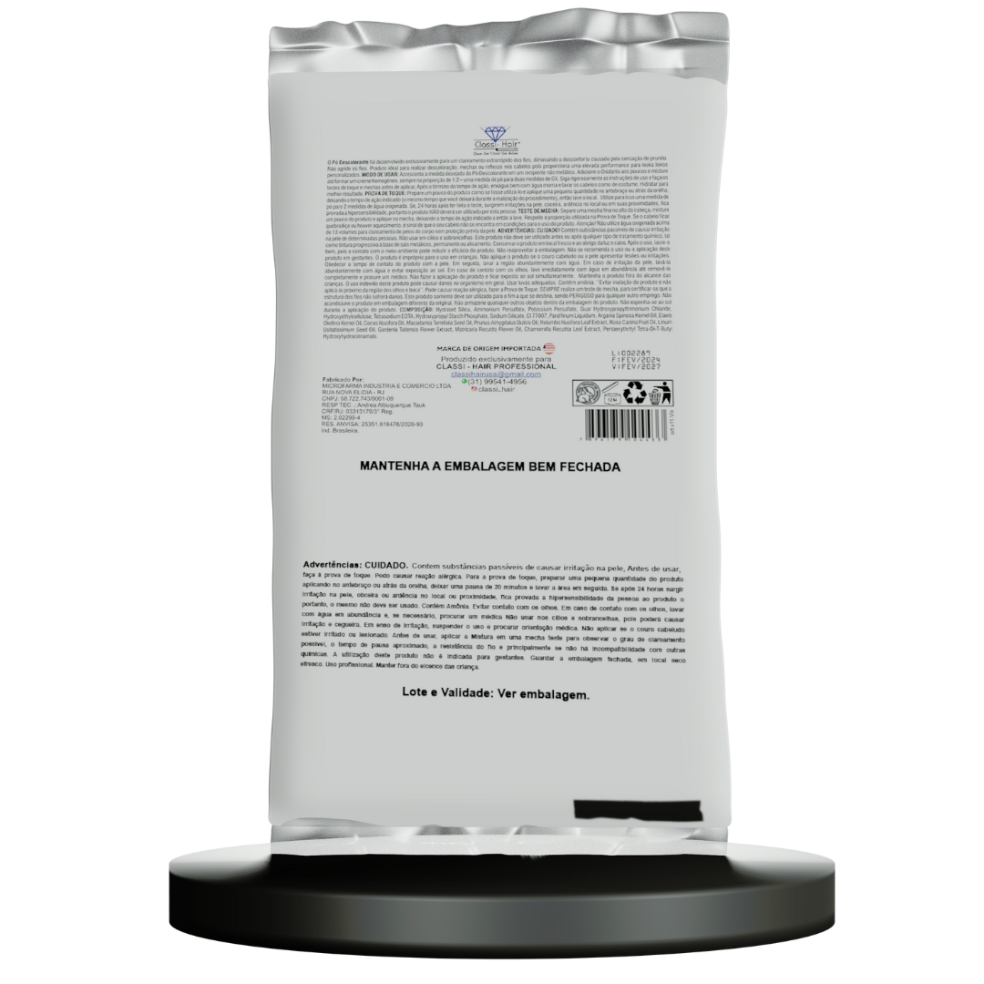 Descoloração ultra-rápida com proteção Plex, grande porcentagem de colágeno, torna a descoloração mais segura evitando danos ao fio.